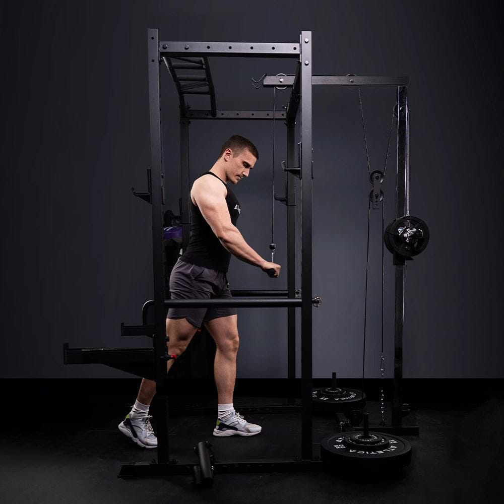 Ein R5 Power Rack ist ein vielseitiges Krafttrainingsgerät von ATLETICA, das für Übungen wie Kniebeugen, Bankdrücken und Klimmzüge verwendet wird. Es bietet Sicherheit und Stabilität durch verstellbare Sicherheitsstangen und ist ideal für intensives Training.