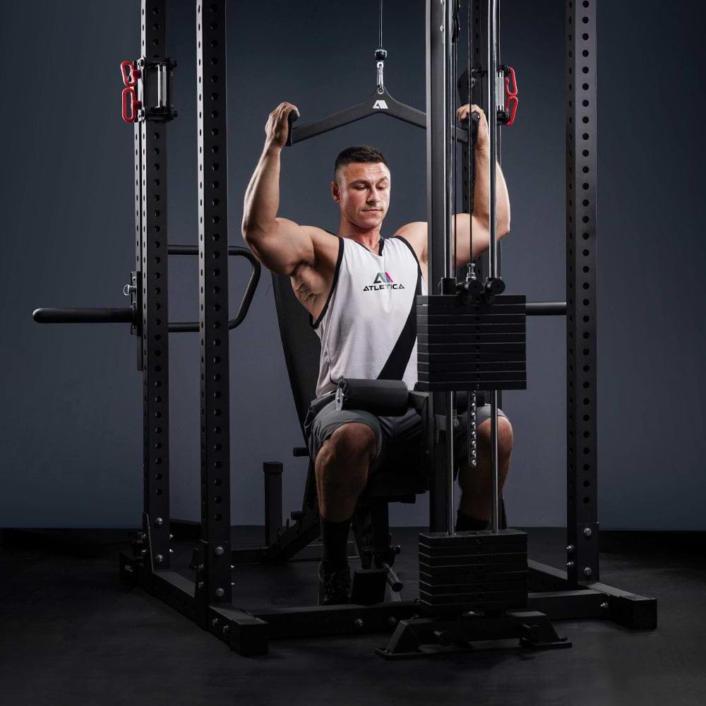 Oft mit integrierten Gewichtsblöcken, Latzug, oder Smith Machine Optionen; gebaut für ernsthaftes Training