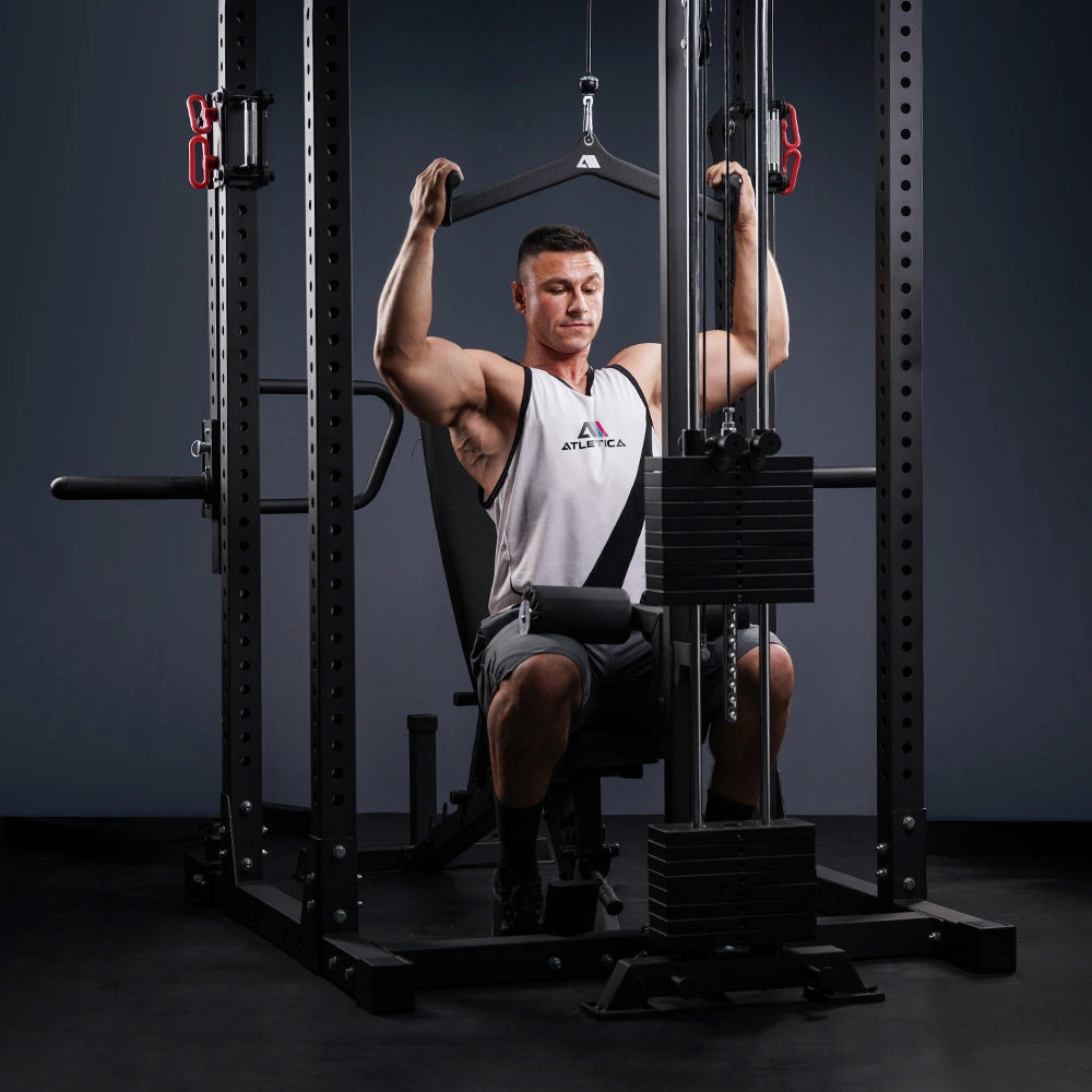 Často s integrovanými zátěžovými bloky, lat tahem nebo možností Smith Machine; určeno pro seriózní trénink