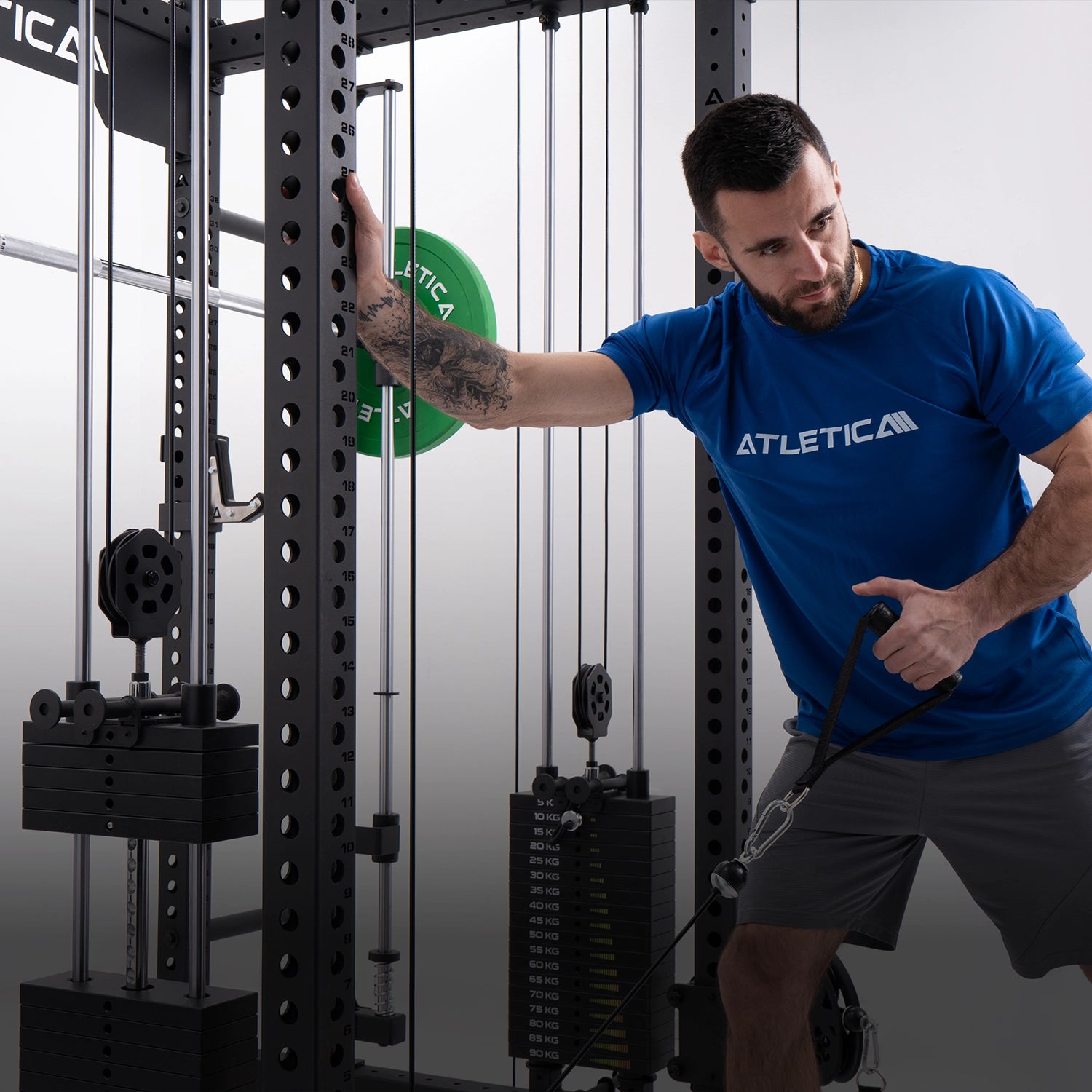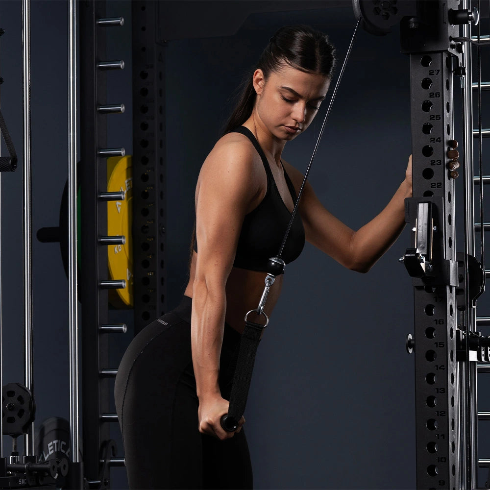 R8 stojan s kladkou nabízí flexibilitu klasického power racku v kombinaci s kladkovým systémem pro izolované cviky. Umožňuje komplexní trénink celého těla a šetří místo, protože spojuje více zařízení v jednom.