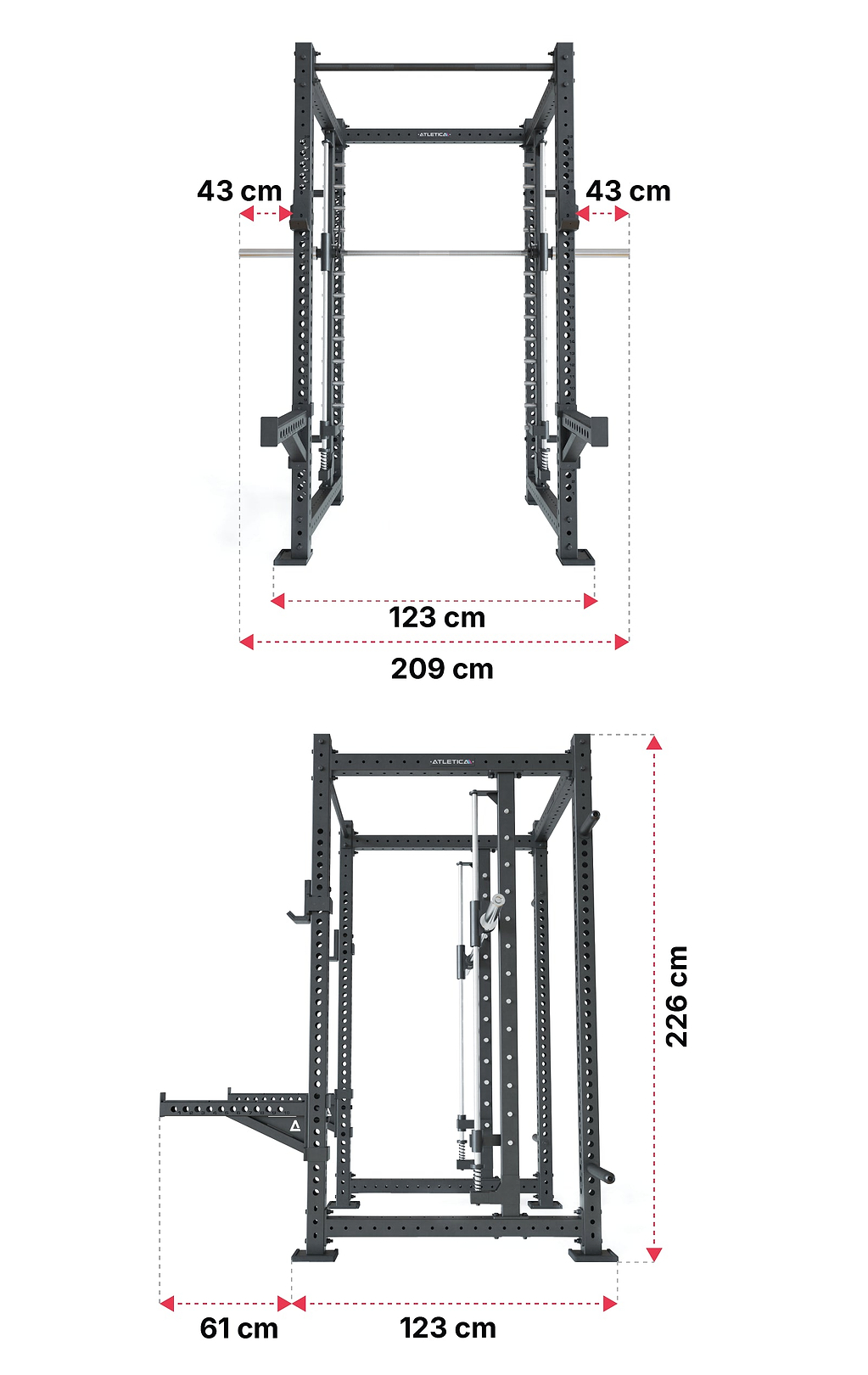J-Hooks a 61 cm dlouhé bezpečnostní Spotter Arms umožňují provádět nespočet cviků s volnou činkou.