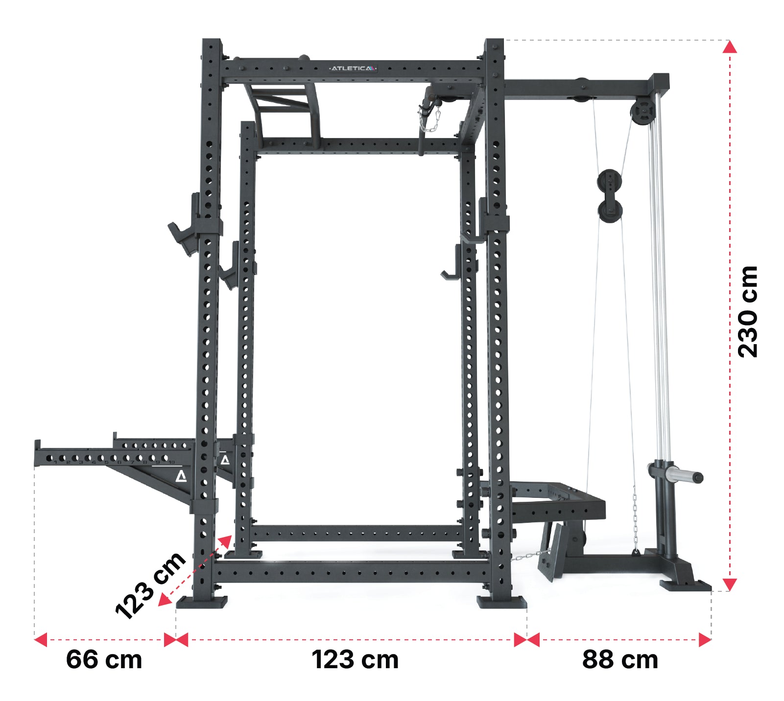Hloubka klece 108 cm a šířka 123 cm nabízejí dostatek prostoru pro neomezené cvičení v racku i před ním.