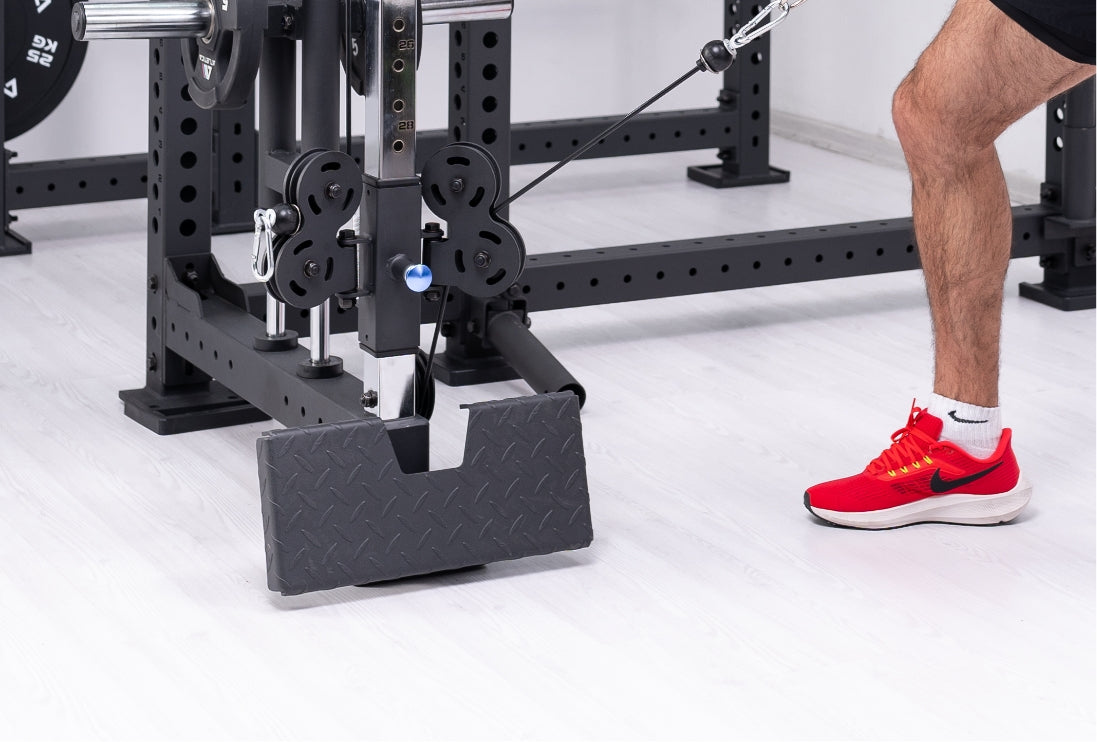Dřepovací klec s bočním kabelovým tahem, který umožňuje trénink až třem osobám současně.