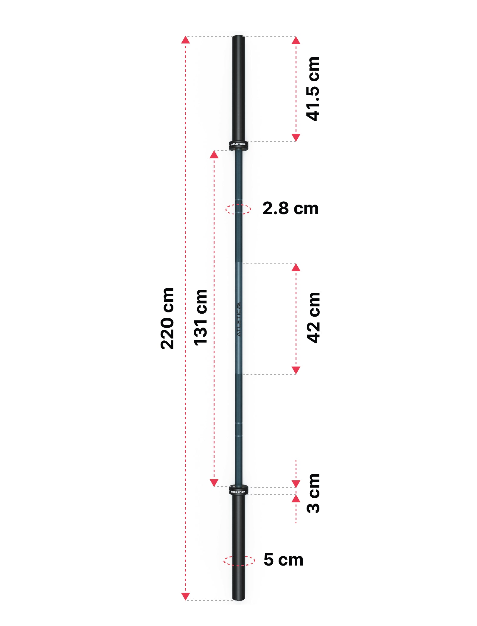 Classic dimensions of 2200 mm length and 20 kg weight and a handle diameter of 28 mm. Optimal all-round barbell for weightlifting, powerlifting and functional training in your home gym.