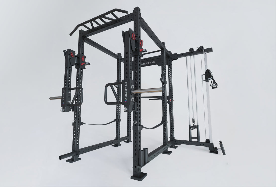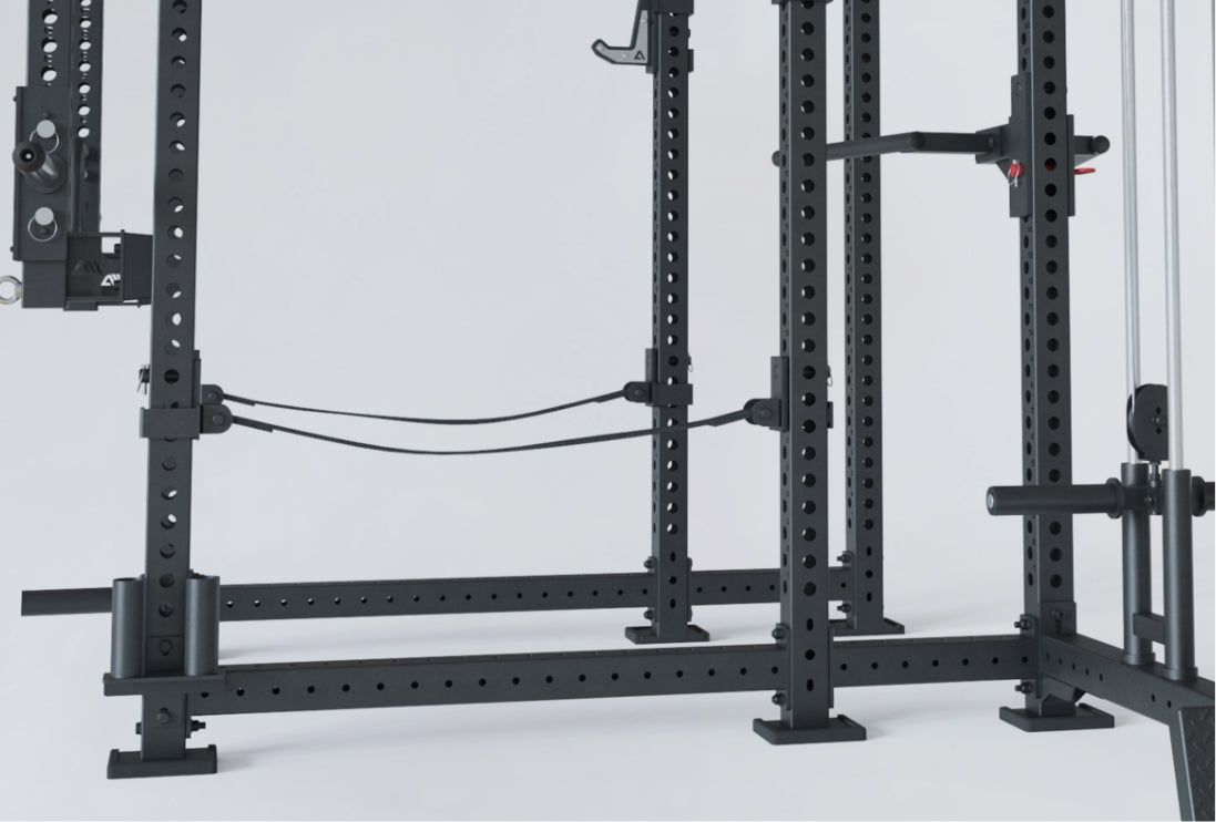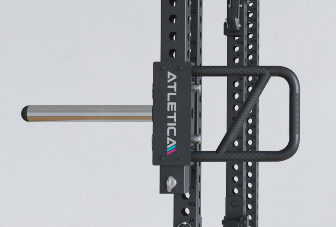 Jusqu'à trois personnes peuvent s'entraîner en même temps dans le rack, et sa largeur de 123 cm est compatible avec toutes les barres standard.