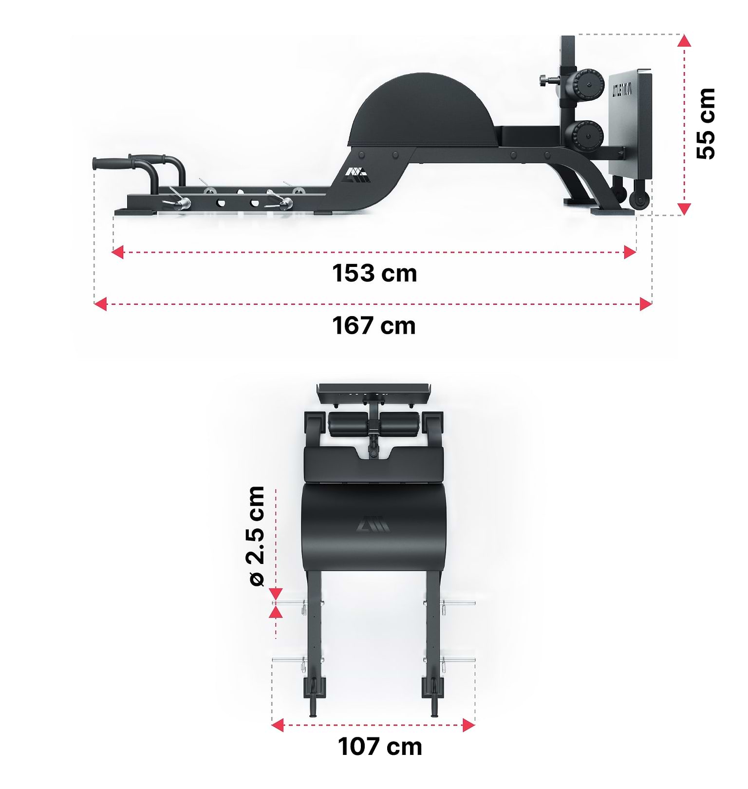 - Con una lunghezza di 167 cm e una larghezza di 107 cm (inclusi i Band Pegs), il Glute Ham Developer offre spazio sufficiente anche per atleti di grande statura