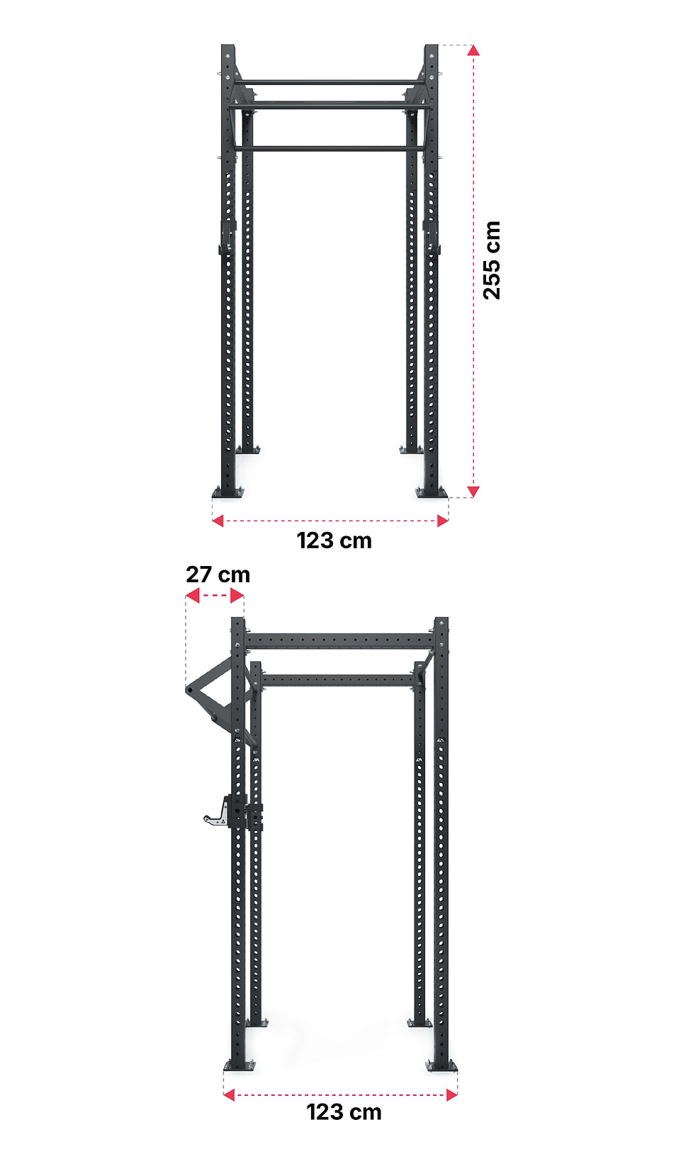 - Con un'altezza di 255 cm, le attrezzature offrono libertà di movimento completa anche per gli atleti più alti. È possibile eseguire trazioni o muscle up senza dover piegare le gambe.