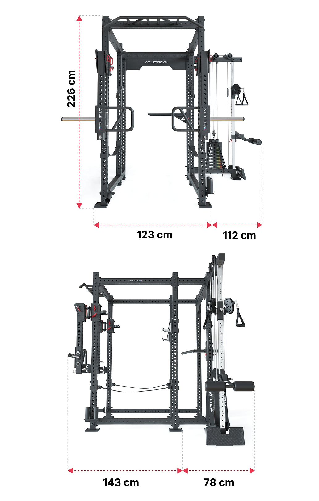 Include Bracci Jammer, Cinghie di Sicurezza, Stazione per Dip, Trainer per il Core, due Barre per Trazioni e Ganci a J Rinforzati.