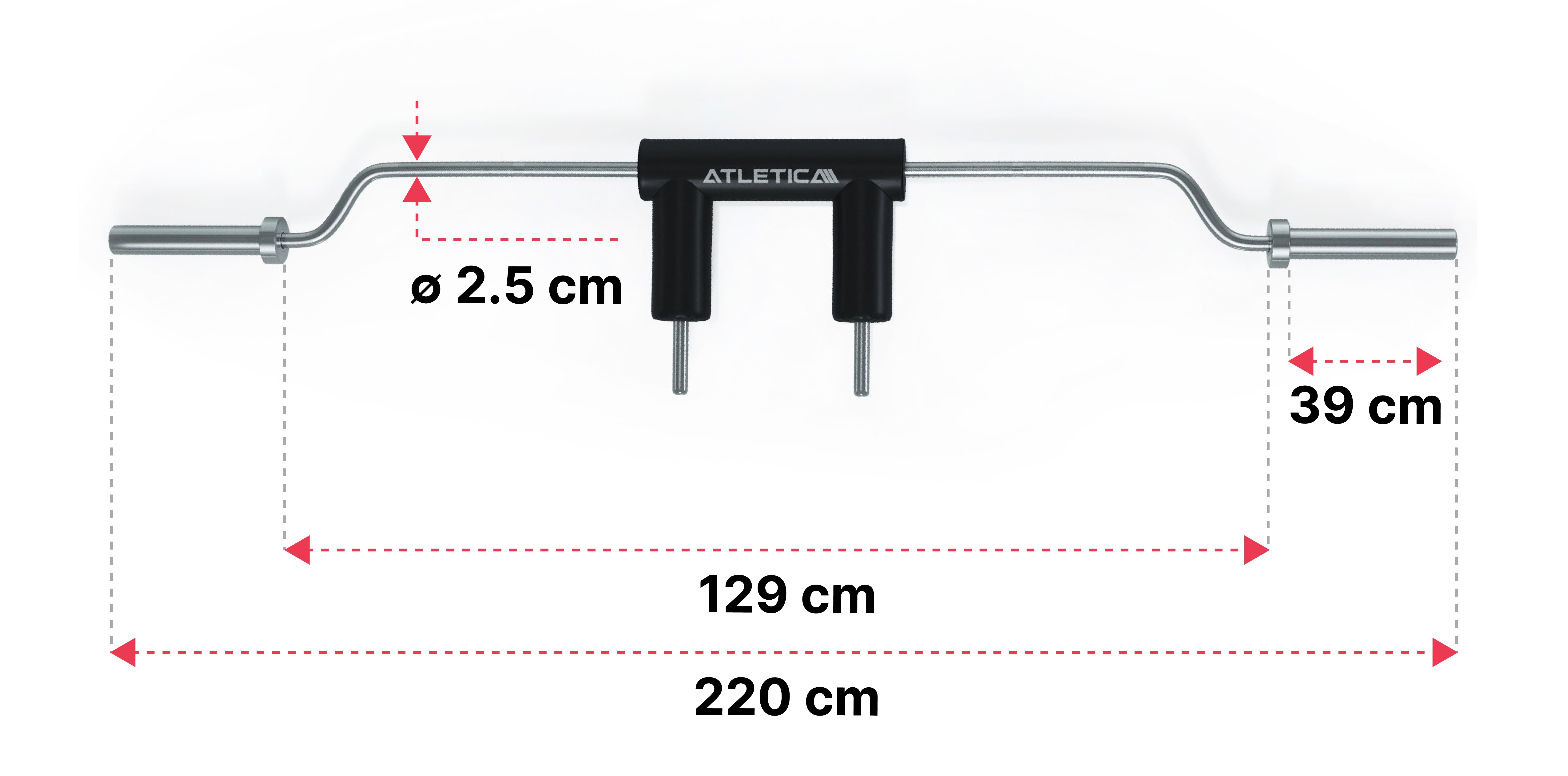 - Con una lunghezza totale di 220 cm, la nostra Safety Squat Bar ha esattamente la stessa lunghezza di un bilanciere olimpico
