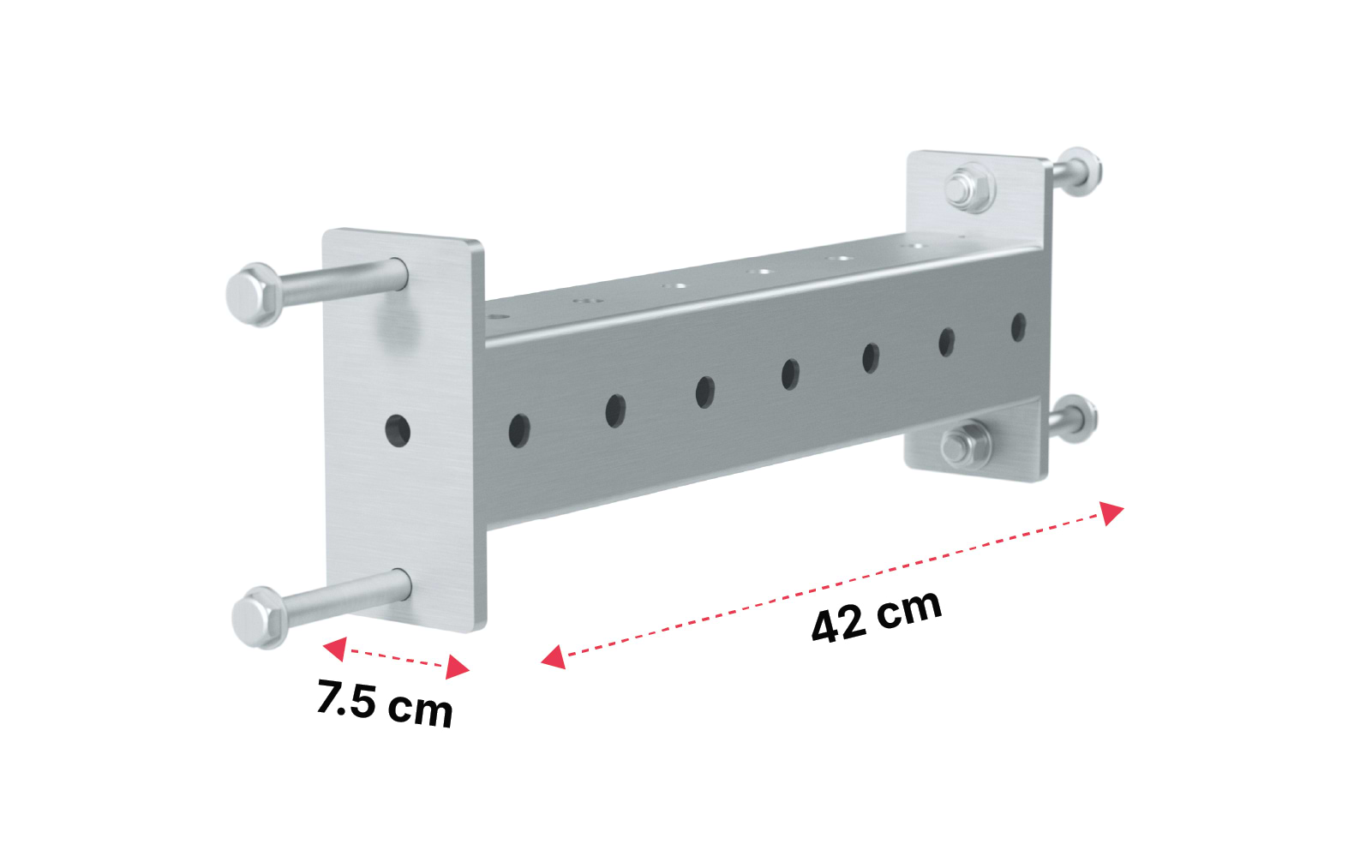 La lunghezza di 42 cm di questa barra, insieme ai 7,5 cm di larghezza degli uprights, offre una profondità totale di circa 50 cm nei nostri rack da esterno R8. - Utilizzabile, ad esempio, in un power rack a 6 montanti per collegare gli uprights posteriori con l'elemento principale del rack.
