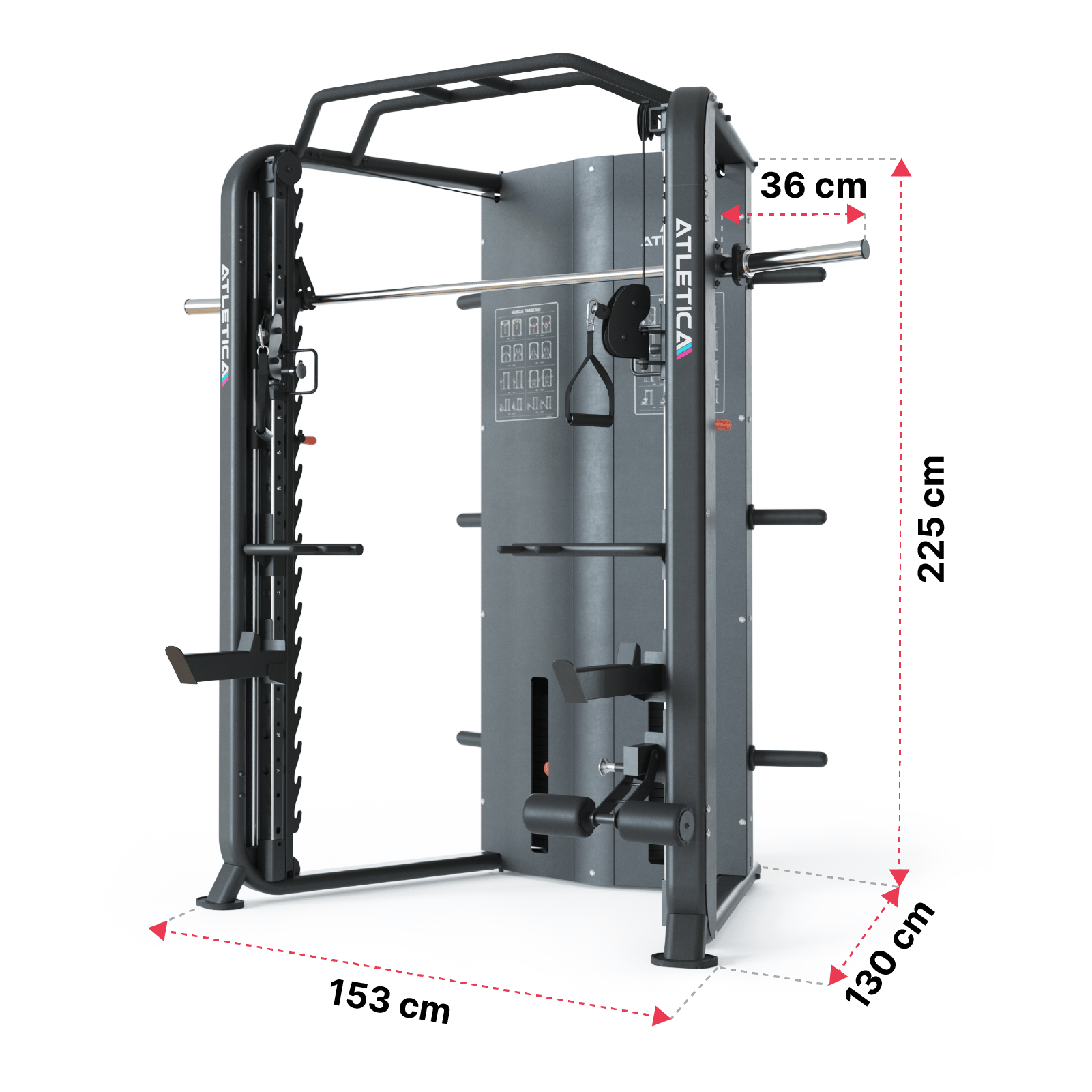 - Daag je Armen, Schouders, Rug, Borst, Buik, Billen en Benen uit met de geïntegreerde Smith Machine – dankzij de Vergrendelingshaken kun je het Gewicht op elke Hoogte veilig Afleggen.