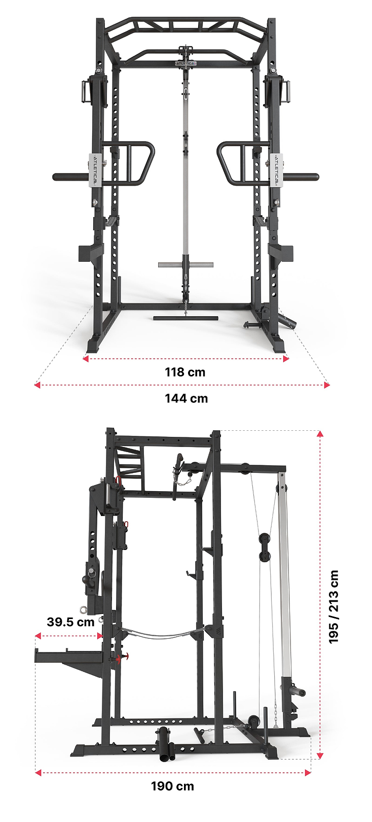 - De breedte van de Power Cage bedraagt 118 cm en is daarmee ideaal voor het eenvoudig wegleggen van olympische halterstangen, maar ook specialty bars met een binnenmaat van 123 cm en meer