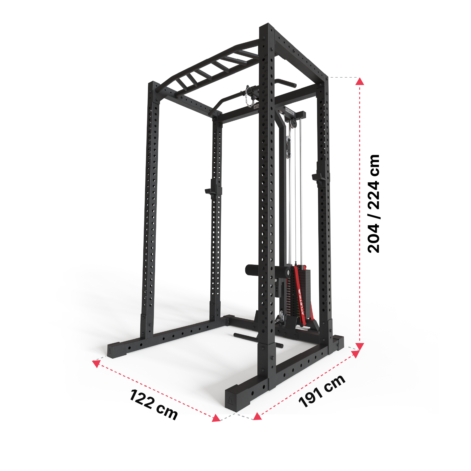- Hierdoor kunnen Oefeningen zoals Bankdrukken en Squats, die verschillende Plaatsingen van de Halterstang vereisen, gemakkelijk aan één Rack worden uitgevoerd