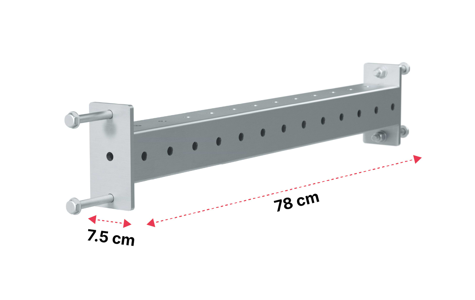 - De Lengte van deze Crossbar van 78 cm resulteert, samen met telkens 7,5 cm breedte per Staander, in een totale diepte van 93 cm bij onze R8 Racks.