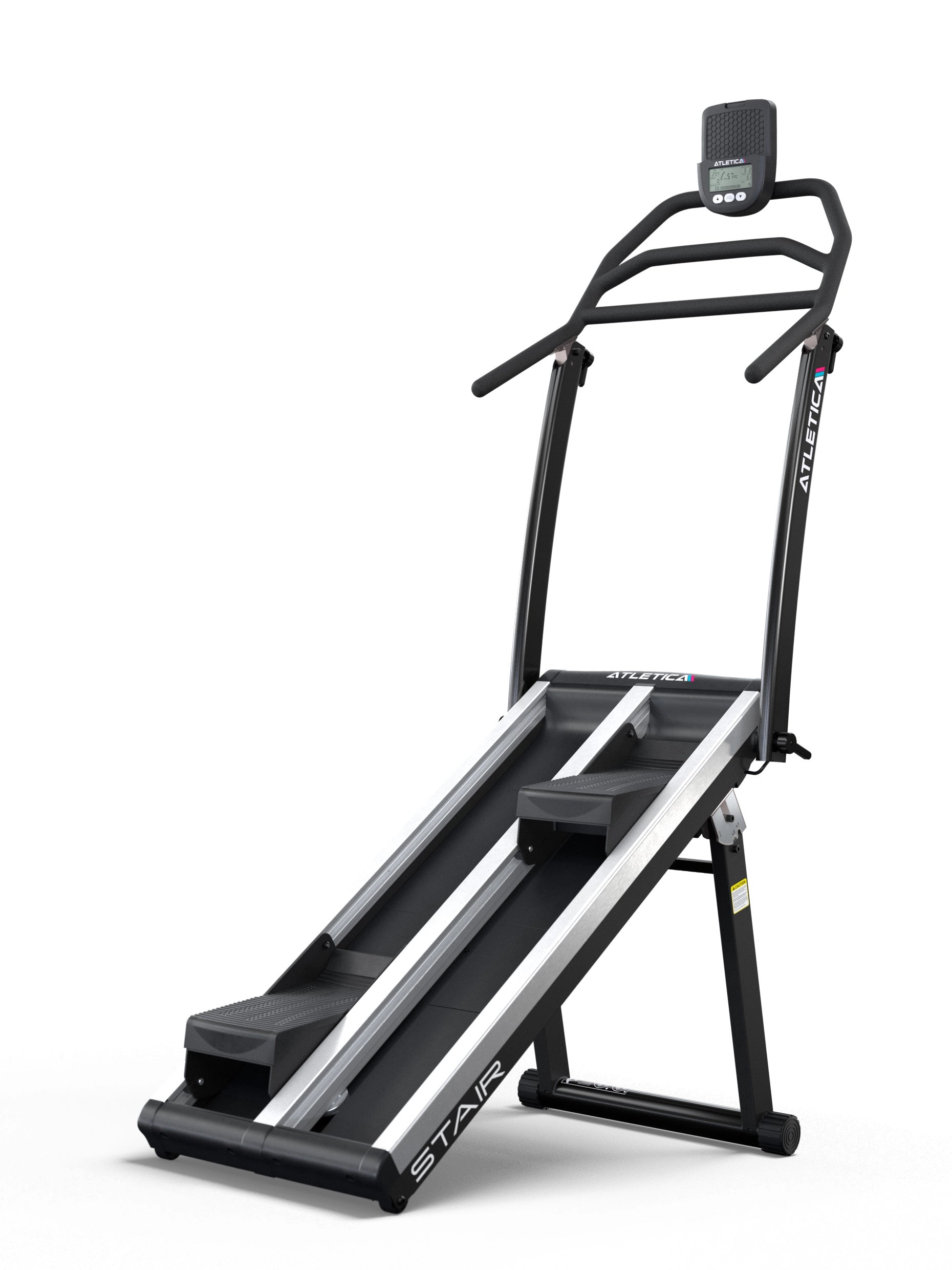 Bluetooth-fähiges LCD-Display mit Zeit-, Stufen/min, Strecke, Neigungs- und Laststufe, Kalorien, Trainingsprogramm sowie weiteren möglichen Anzeigen