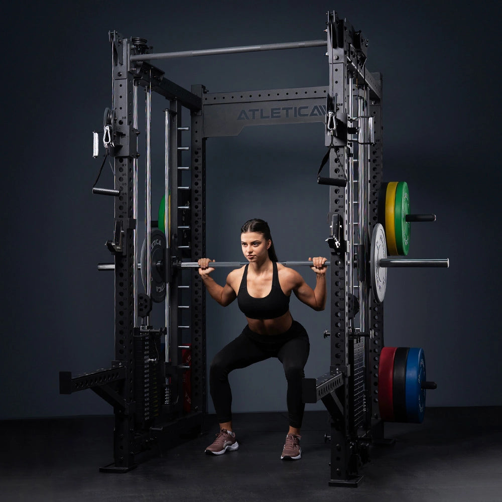 Często z wbudowanymi stosami ciężarów, wyciągiem górnym lub opcją Smith Machine; przeznaczone do poważnego treningu