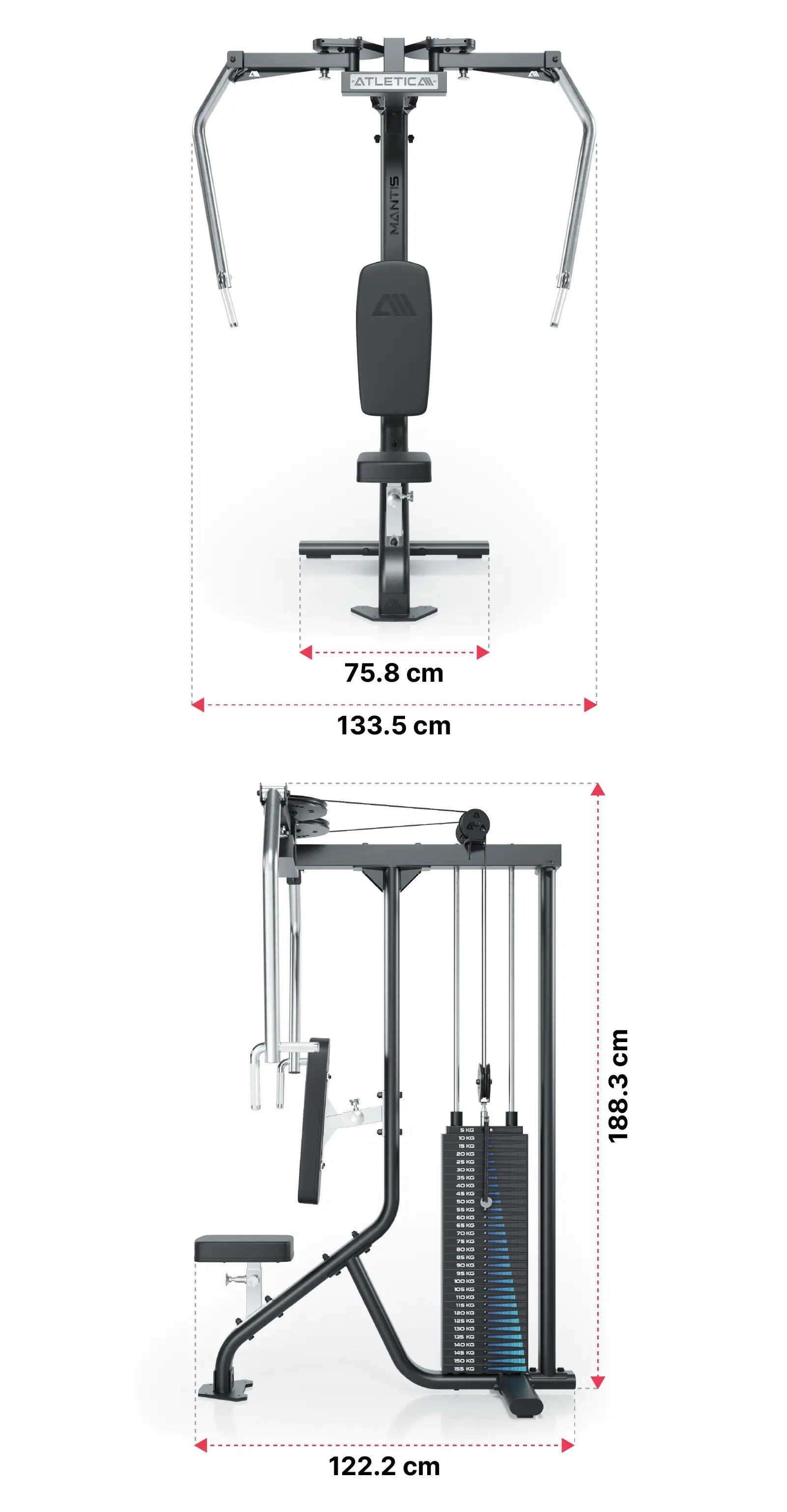 - Ramiona dźwigni swobodnie układają się na boki, co pozwala na indywidualne dopasowanie do każdego wzrostu i długości ramion, zapewniając pełny zakres ruchu