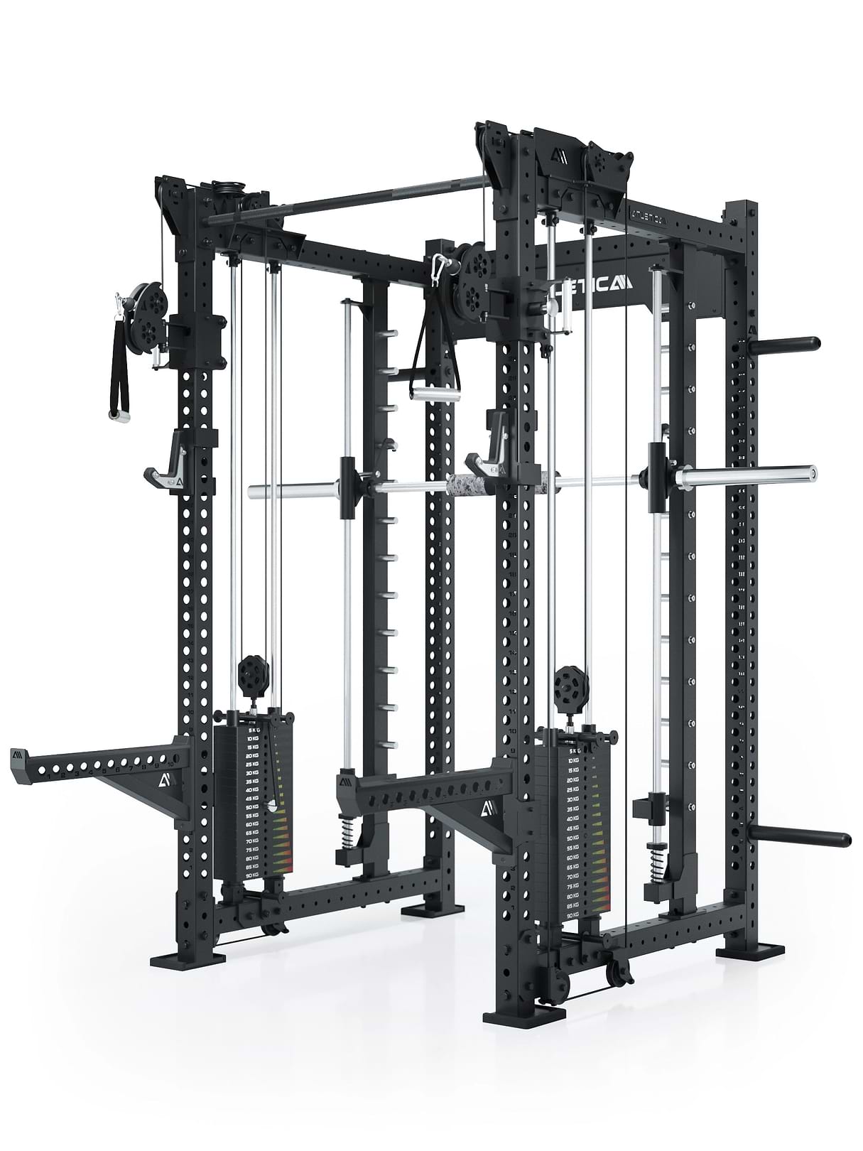 - Kompleksowy system do siłowni domowej: stojak treningowy + wyciąg kablowy + zintegrowana maszyna Smitha