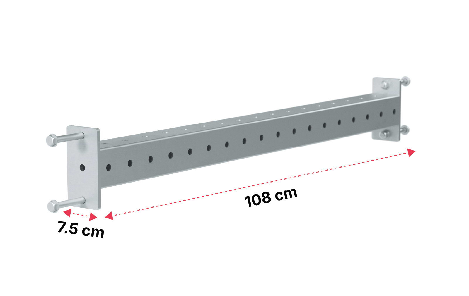 - Długość 108 cm tej poprzeczki, w połączeniu z szerokością 7,5 cm na stojak, daje całkowitą głębokość lub szerokość 123 cm w naszych R8 Outdoor Power Rackach.