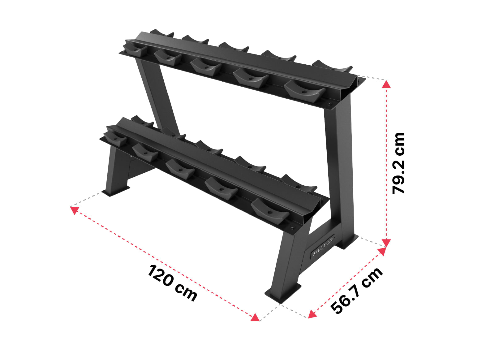 - Obie poziomy półek są lekko pochylone do przodu, co ułatwia podnoszenie i odkładanie hantli