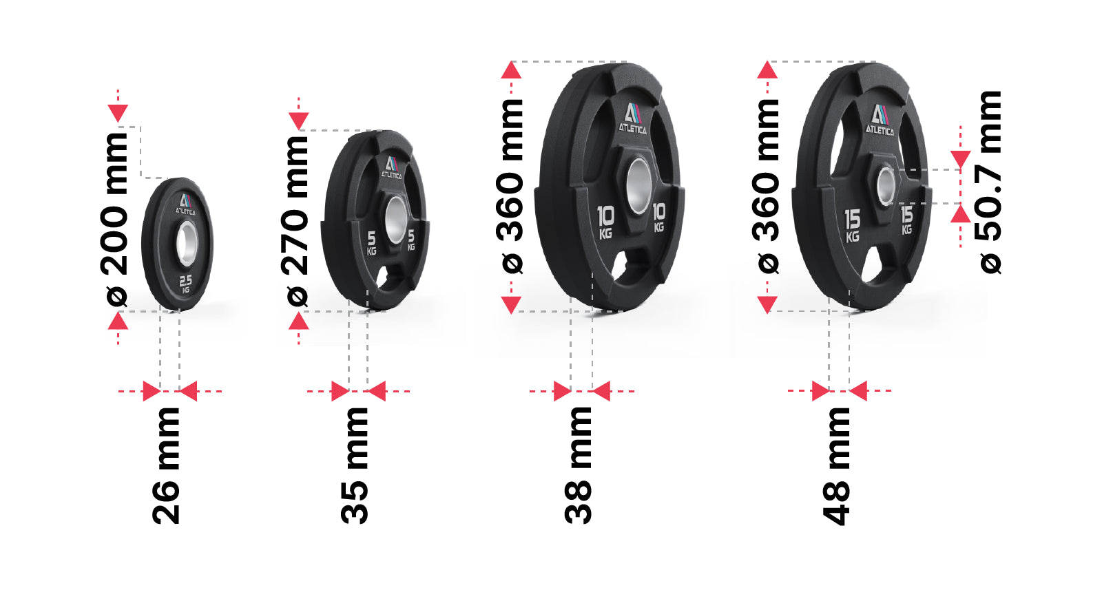 Mit einem Durchmesser von 42 cm sind selbst die beiden größten Scheiben mit 20 kg und 25 kg um 3 cm kompakter als herkömmliche Bumper Plates.