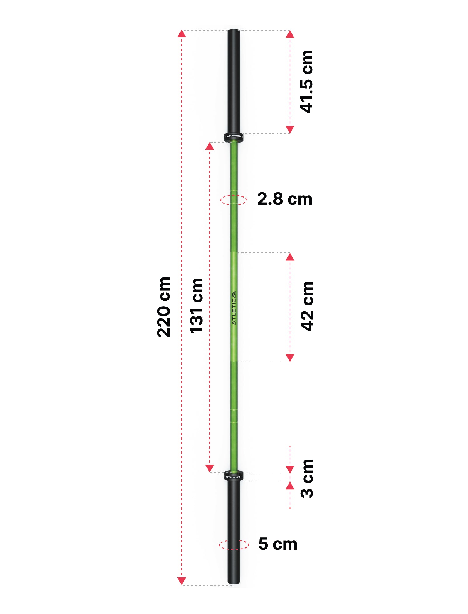 Klasssische Maße von 2200 mm Länge und 20 kg Gewicht und einem Griffdurchmesser von 28 mm. Optimale Allround Langhantel für Gewichtheben, Powerlifting und Funktionellem Training in deinem Home Gym.