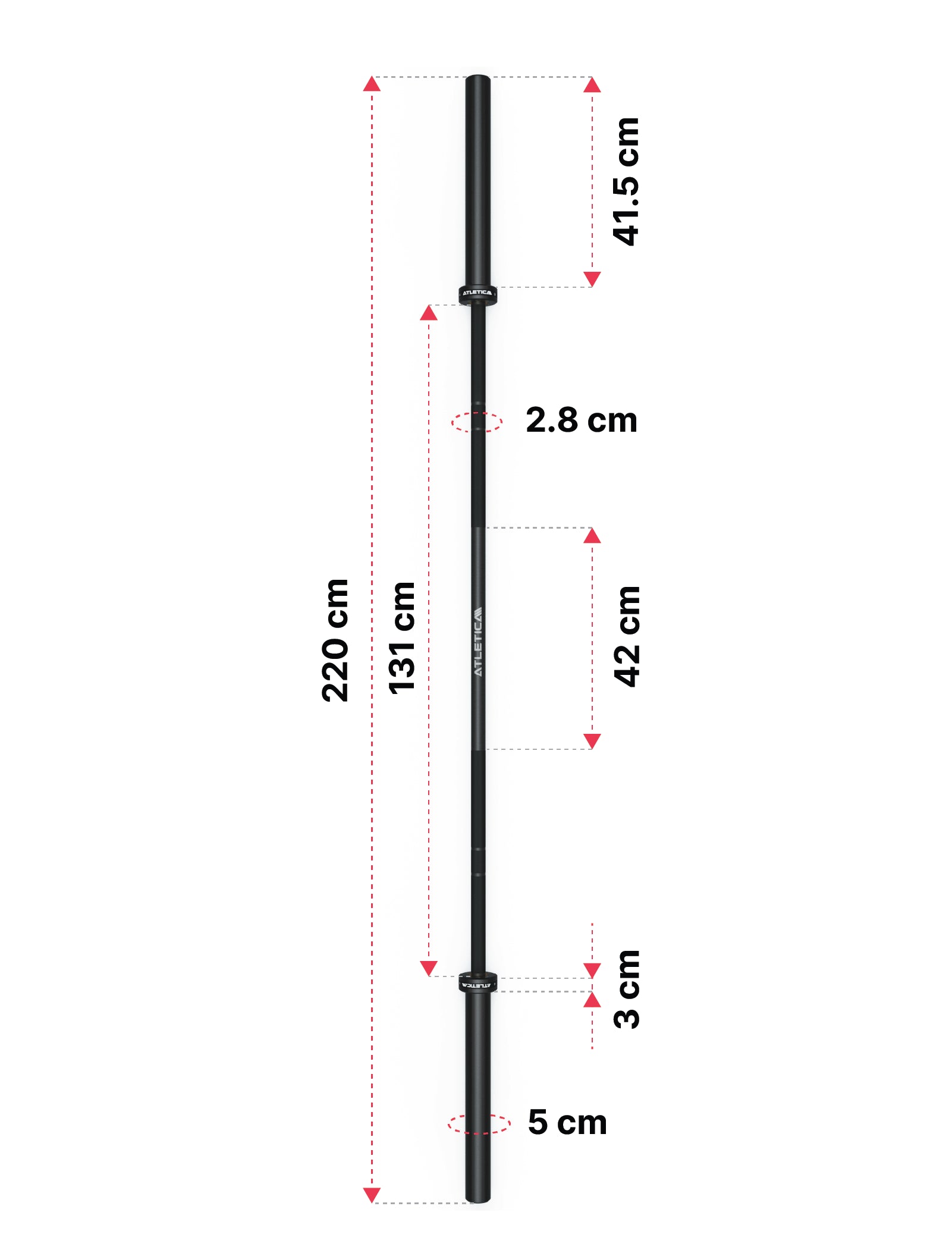 Klasssische Maße von 2200 mm Länge und 20 kg Gewicht und einem Griffdurchmesser von 28 mm. Optimale Allround Langhantel für Gewichtheben, Powerlifting und Funktionellem Training in deinem Home Gym.