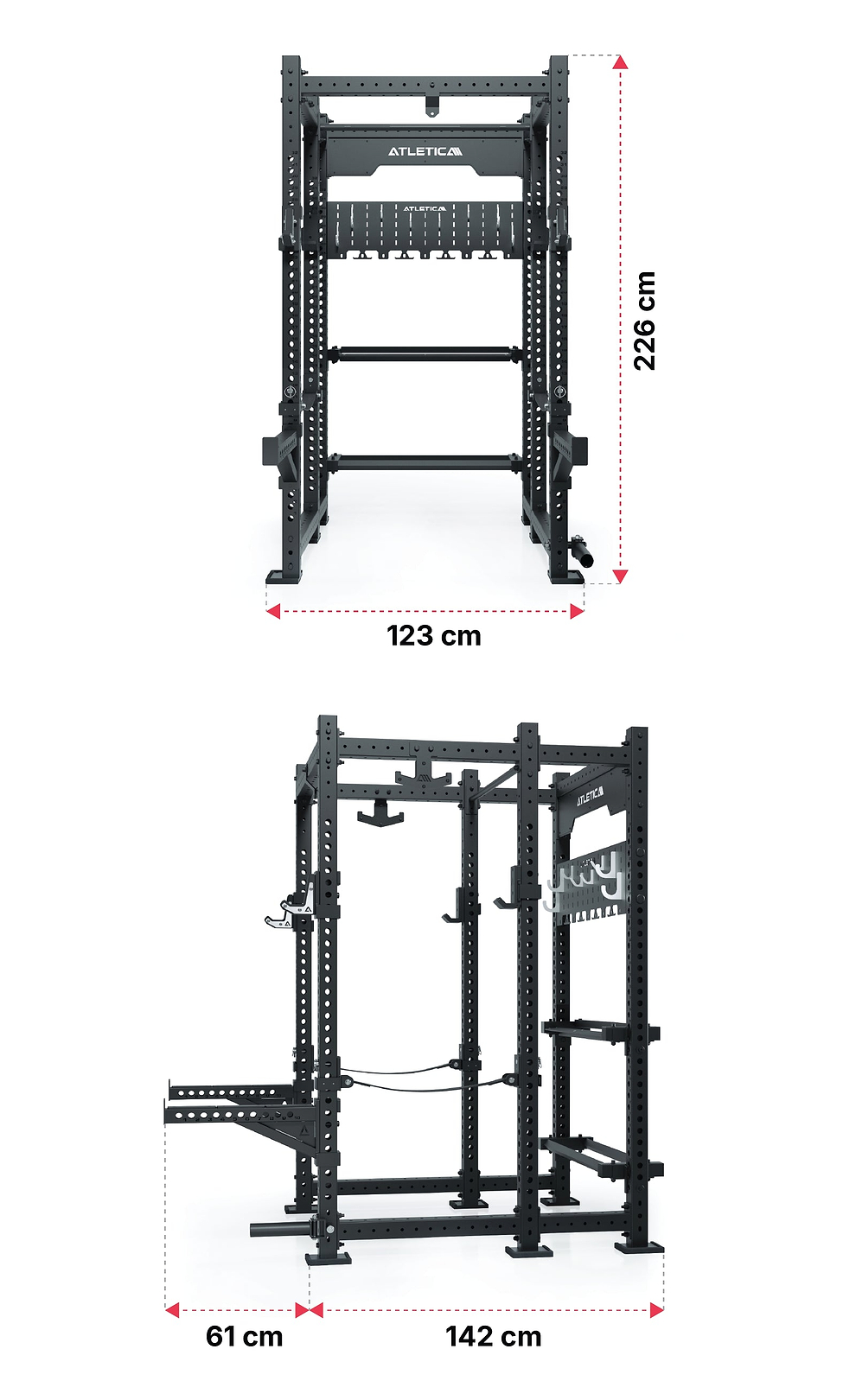 | Tiefe | 142cm Power Rack + 61cm Spotter Arms |