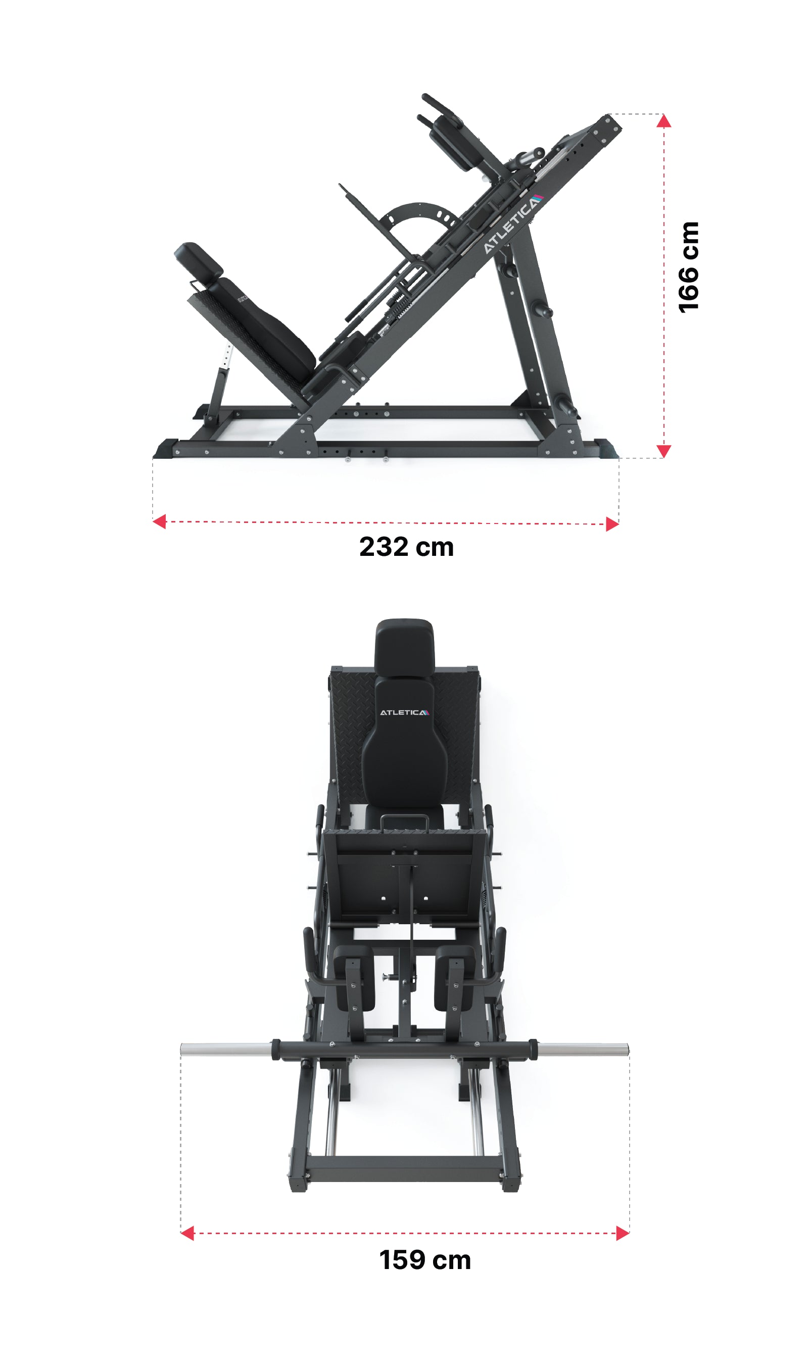 - Den genomtänkta konstruktionen möjliggör snabb och säker omställning från klassisk benpress till hack squat-maskin och tillbaka, tack vare funktionella vikmekanismer