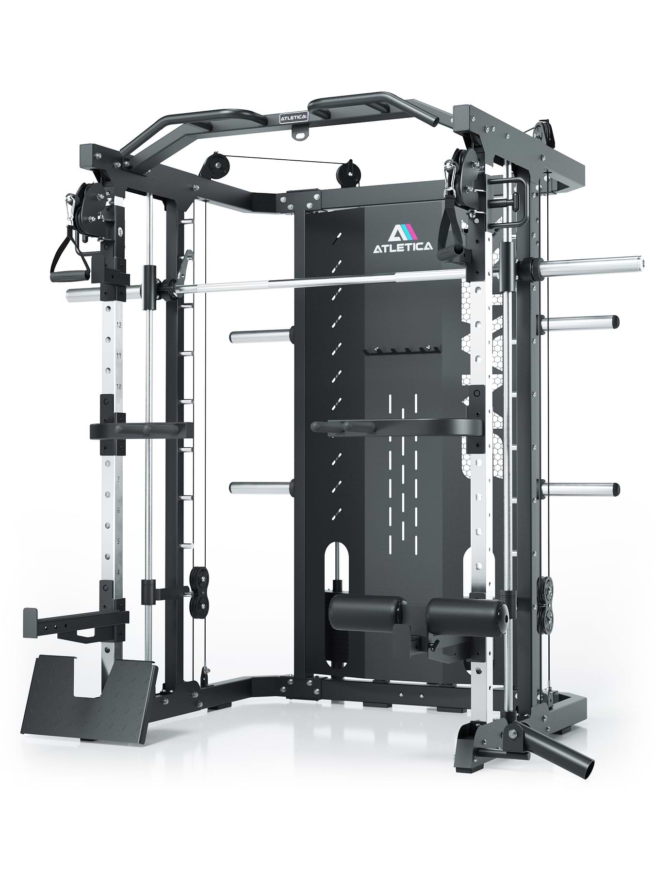 - Power rack, smithmaskin och dubbelt kabeldrag kombinerade