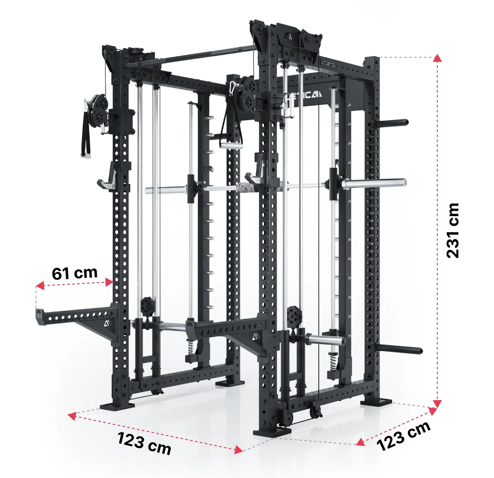 R8-Bradley kombinerar stabiliteten hos ett power rack med flexibiliteten hos en kabelmaskin.
