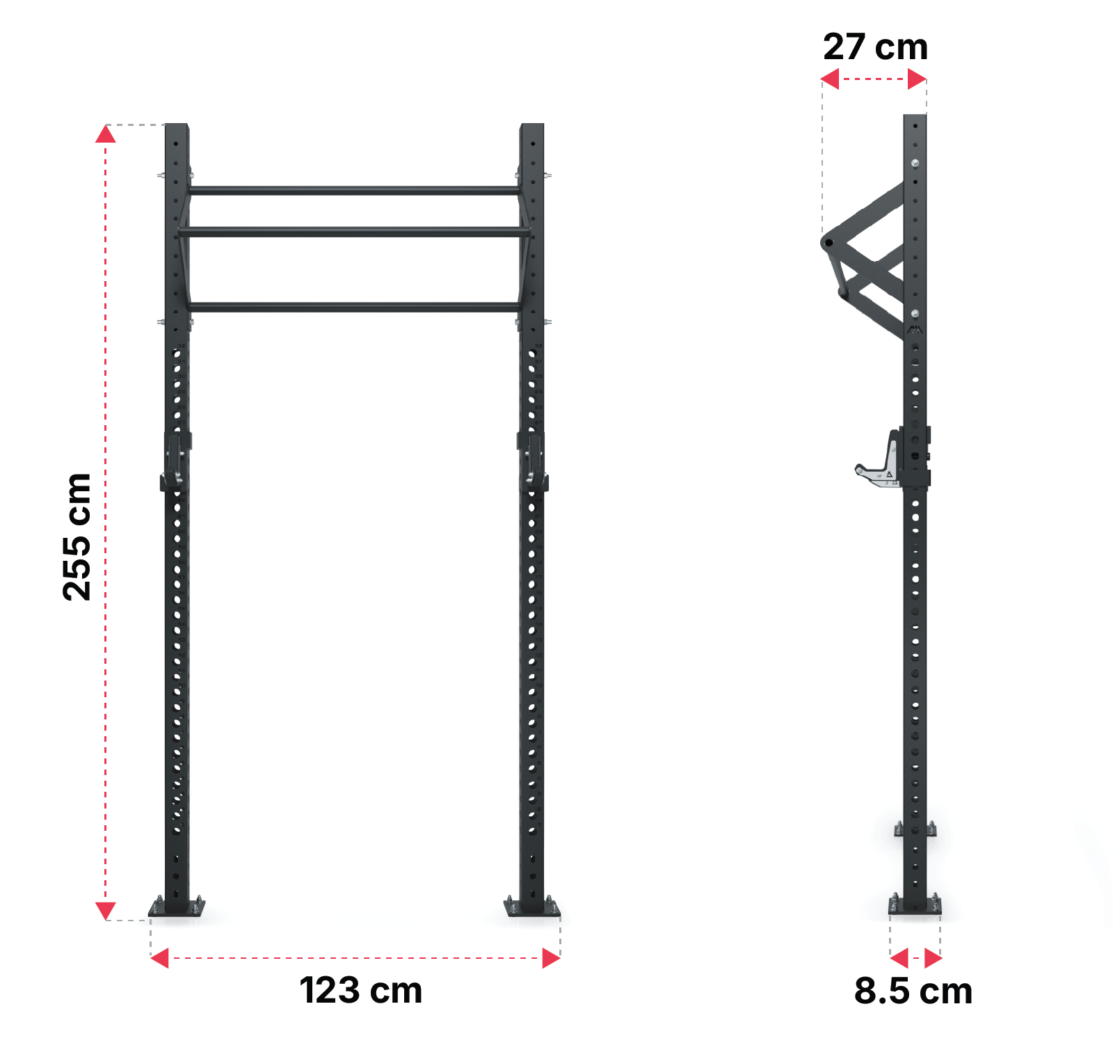 - Med en höjd på 255 cm erbjuder enheterna full rörelsefrihet även för långa personer. Det betyder att du kan göra pull-ups eller muskelupptagningar utan att behöva böja benen.
