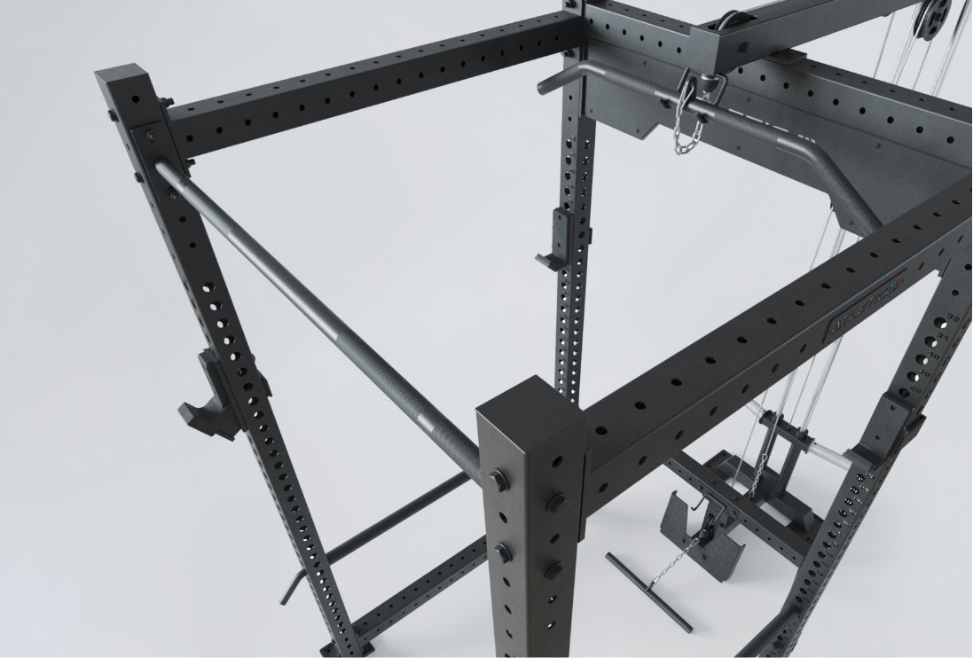 Inklusive latsdragsstation med roddenhet, chinsstång, förstärkta J-hooks och pin-and-pipe-safeties.