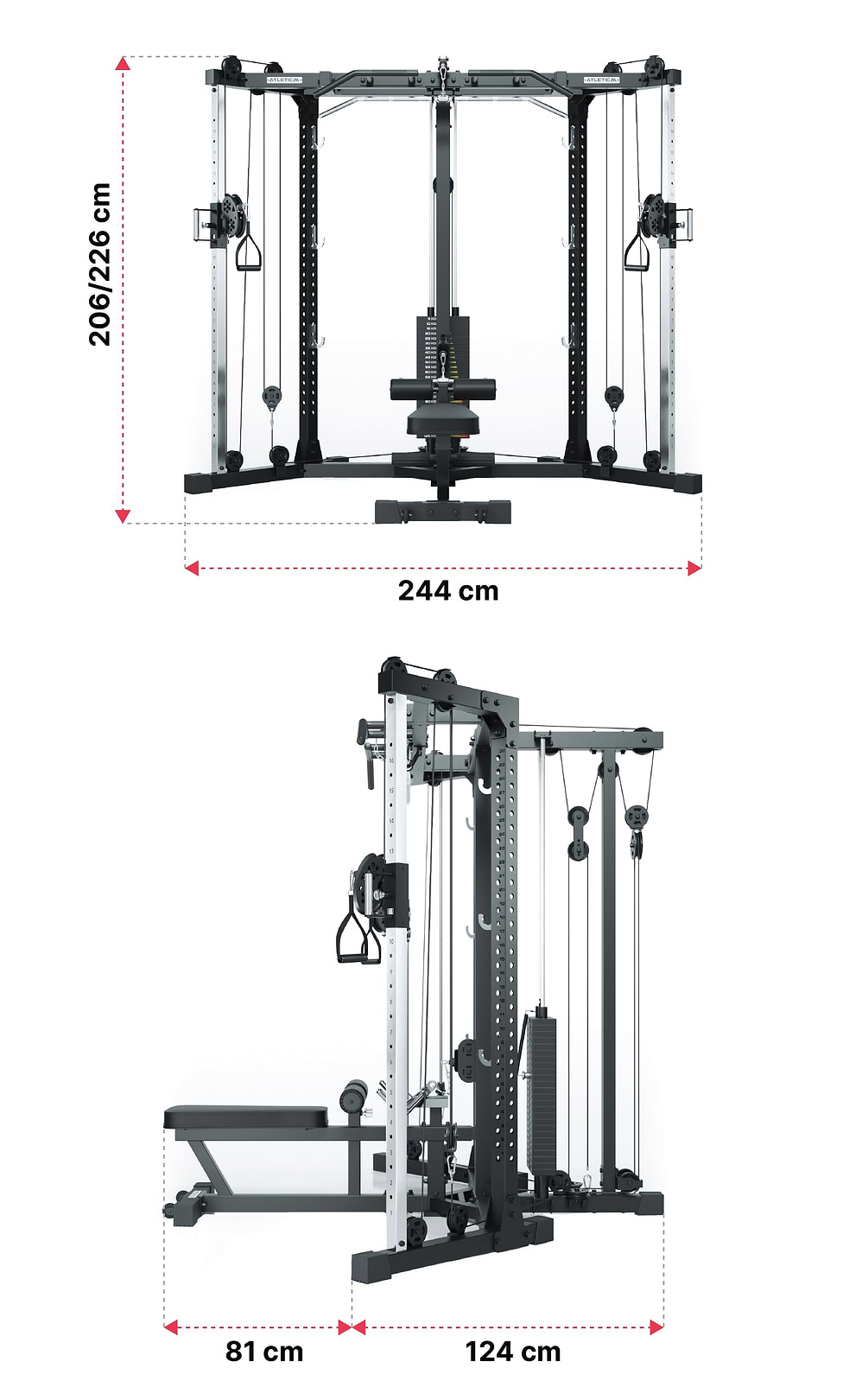 | Djup | 124cm (205cm med träningsbänk) |